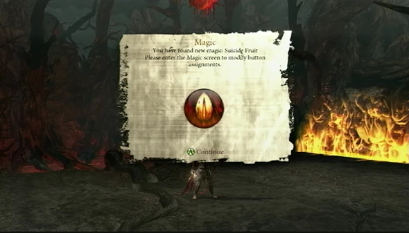 The Suicide Fruit spell was obtained after meeting Dante's mother in the Circle of Violence. It was a powerful Unholy spell that allowed Dante to slam the rotting fruit of a Suicide Tree into the ground, stunning nearby enemies. The spell could be leveled up to increase its range of effect.